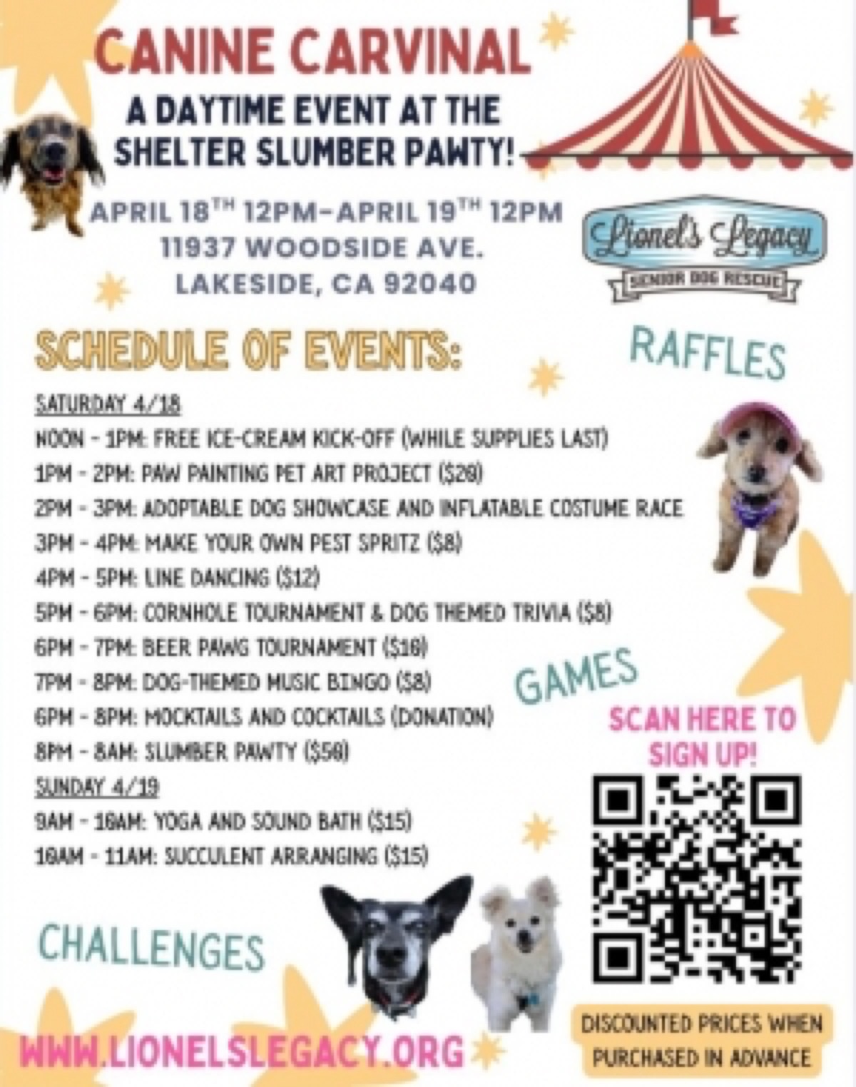 Lionel's Legacy, an East County rescue focused on senior dogs, is hosting its first Canine Carnival on Saturday in Lakeside, followed by an overnight slumber party and additional activities on Sunday morning. The nonprofit says the event will be held at 11937 Woodside Ave.