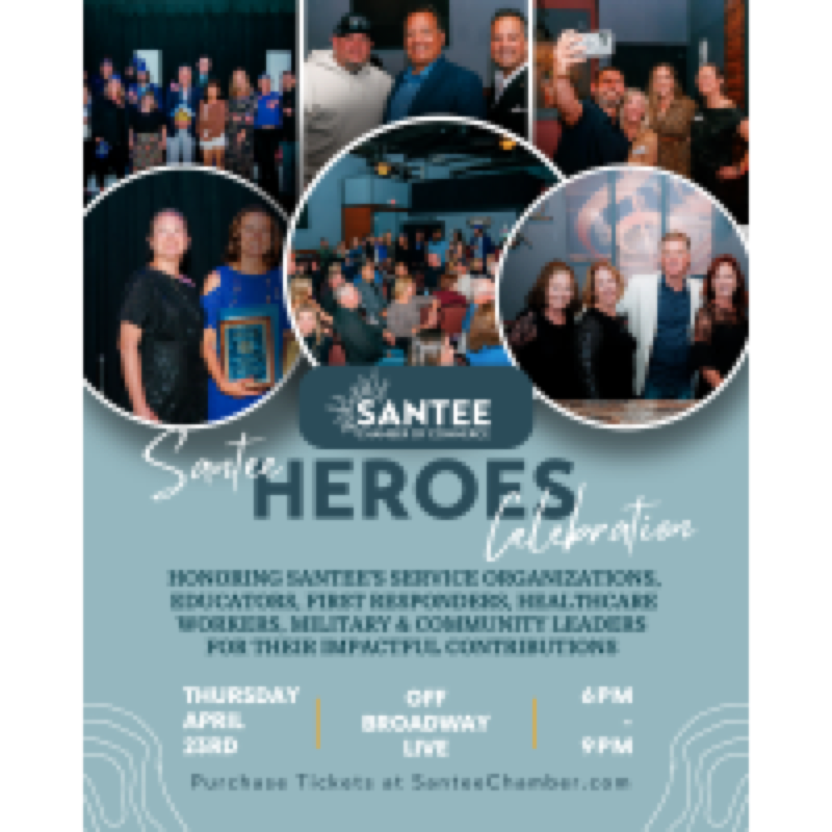 The Santee Chamber of Commerce will host its 2026 Santee Heroes Celebration on Thursday, April 23, in Santee. According to the chamber's event page, the evening will recognize local service organizations, educators, first responders, healthcare workers, community leaders, elected officials, and the chamber's Person of the Year honoree.